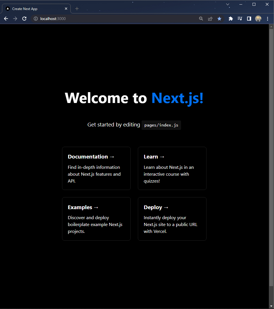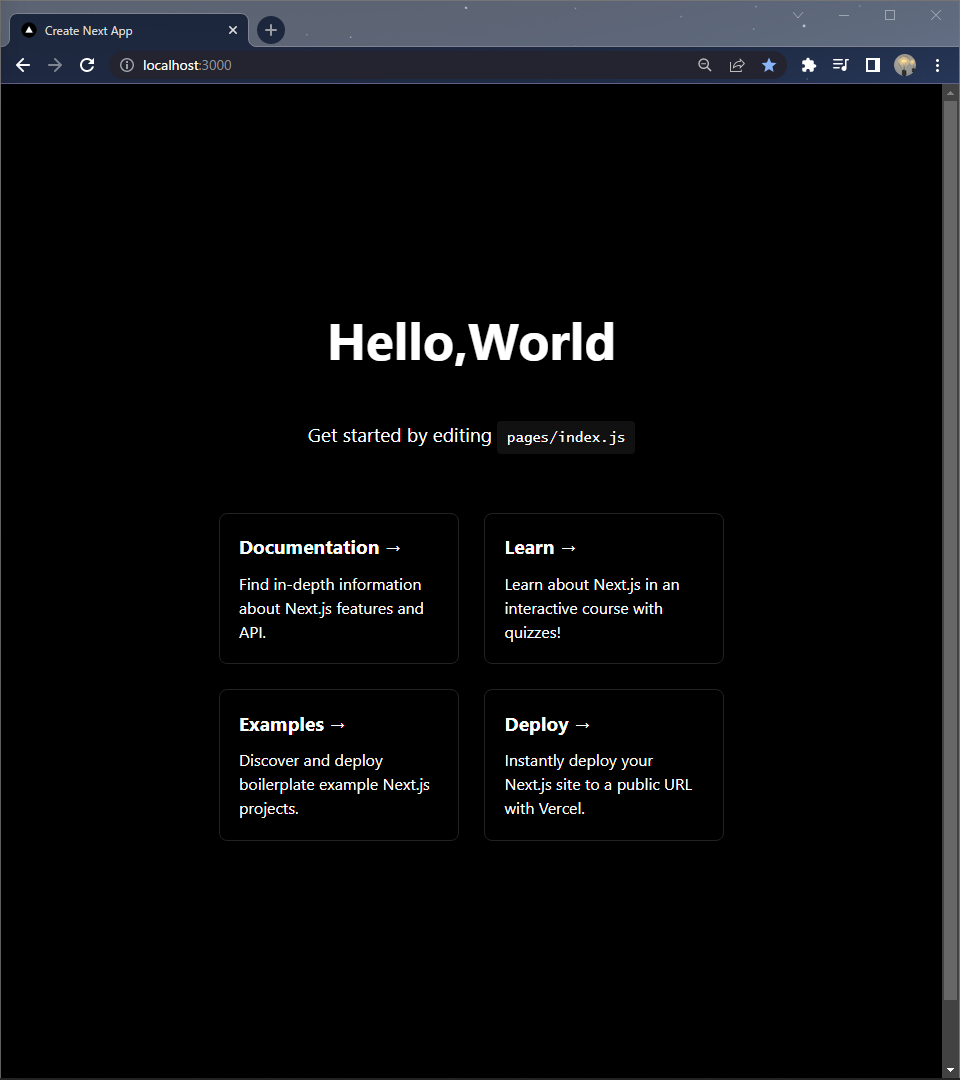 ブラウザでlocalhost:3000にアクセスすると、Next.jsプロジェクトが起動していることを確認できます。